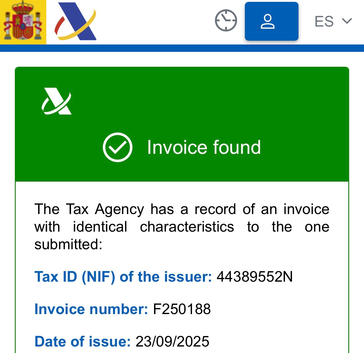 También he comprobado que el QR enlaza con la página correcta de la AEAT donde se puede consultar el NIF emisor de la factura, el número de factura, la fecha y el importe total (base + IVA).