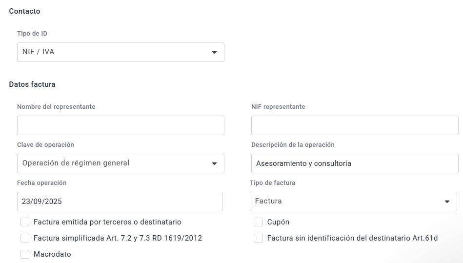 La experiencia ha sido un poco a trompicones. Generar facturas en Holded es muy sencillo, si bien al optar por Verifactu tienes que rellenar algunos campos extra. Concretamente estos de aquí: