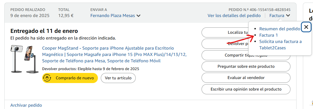 Luego por si fuera poco trabajo, resulta que la persona que ha hecho el pedido no se aclara con el interface de Amazon y no te sabe sacar la factura. Aunque esto la verdad es que es bastante sencillo, solo hay que ir a Pedidos y pulsar en la esquina superior derecha: