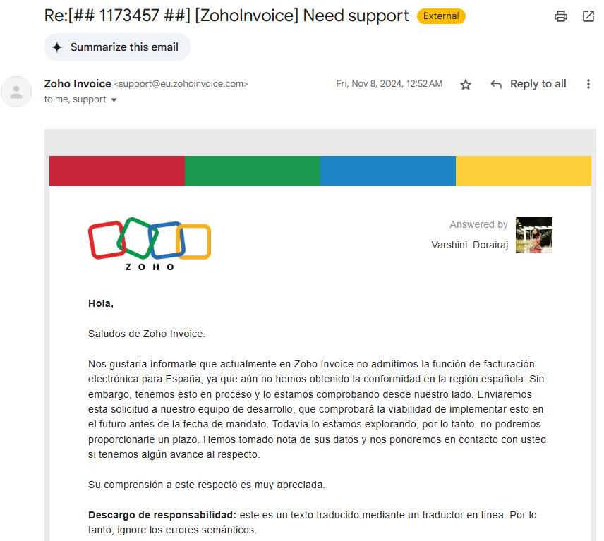 Nosotros nos hemos puesto en contacto con otras empresas internacionales como ZOHO cuyo software genera facturas (ZOHO CRM, ZOHO Invoice, ZOHO Books) y no hemos recibido una respuesta clara al respecto: